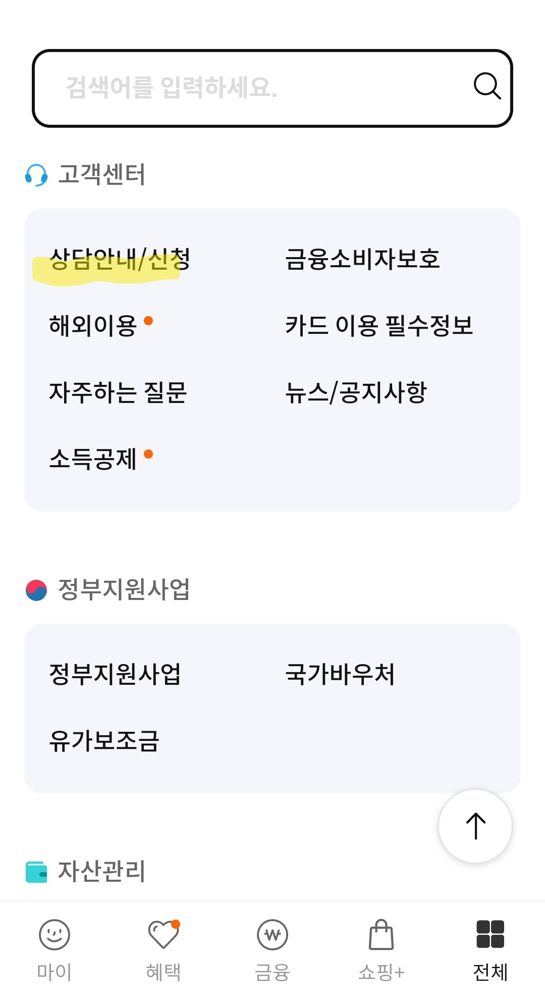 2. 로그인 > 하단 전체 클릭 > 드래그 > 고객센터 '상담안내/ 신청 클릭