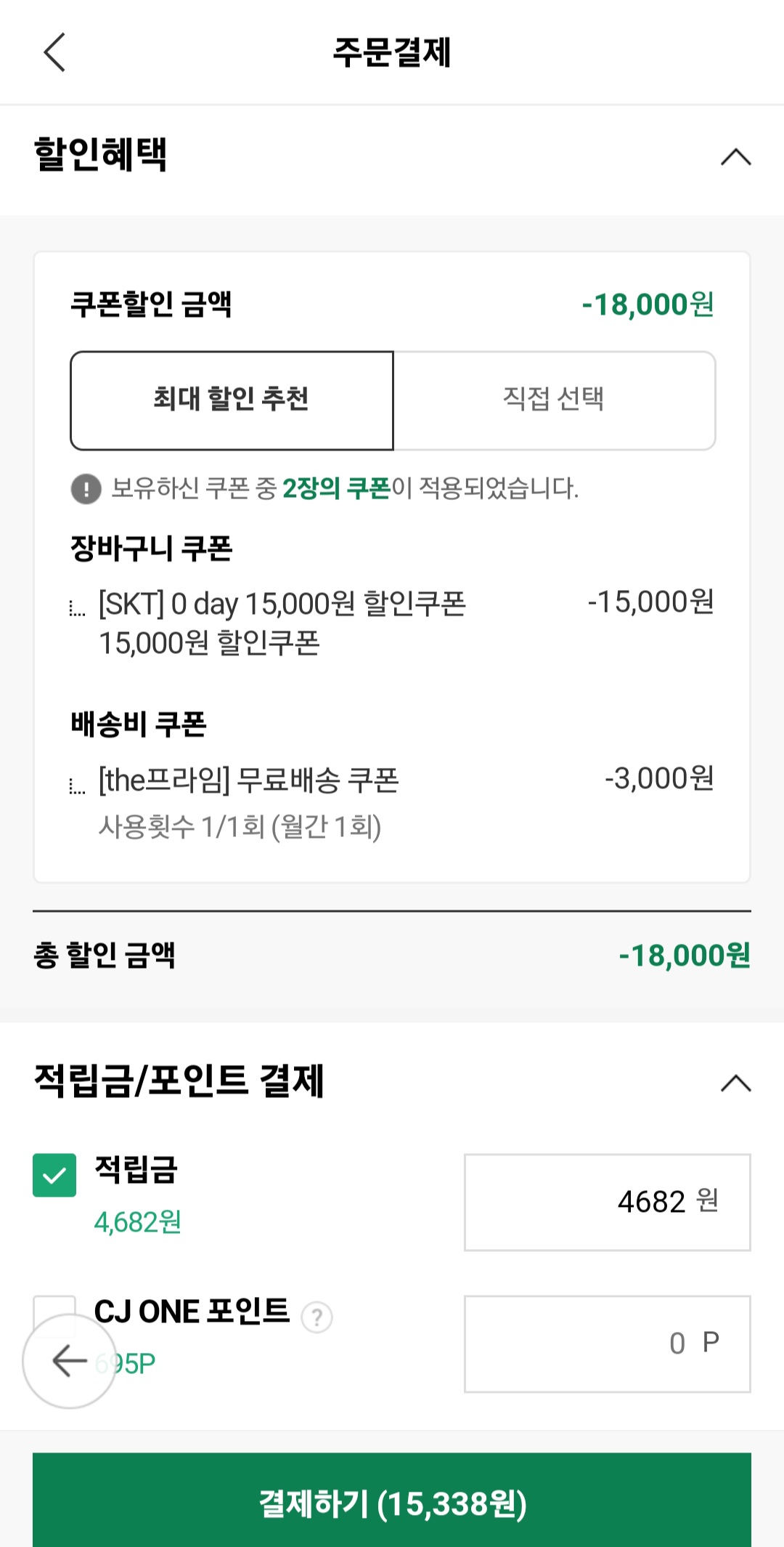 그다음 포인트 할인/ 배송비 할인으로 4가지를 15,338원에 구매했습니다.